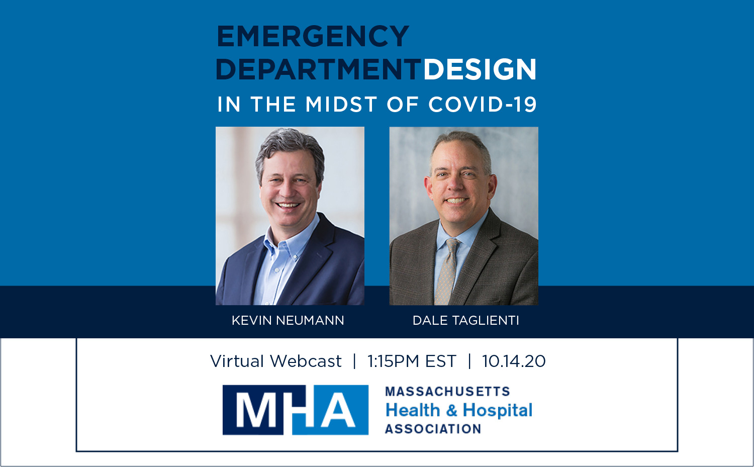 Kevin Neumann, AIA, ACHE, Partner, and Dale Taglienti, Leed AP, Partner, are guest panelists on Emergency Department Design in the Era of COVID-19 along with Paulette Vieira, MSN, MBA, RN, NE-BC, Director of Nursing/Patient Services & Emergency Services, Boston Children’s Hospital. The Massachusetts Health & Hospital Association (MHA) virtual webcast Excellence in the Emergency Department is Wednesday, October 14, 2020, 11am – 2:30pm EST. For more information or to register.