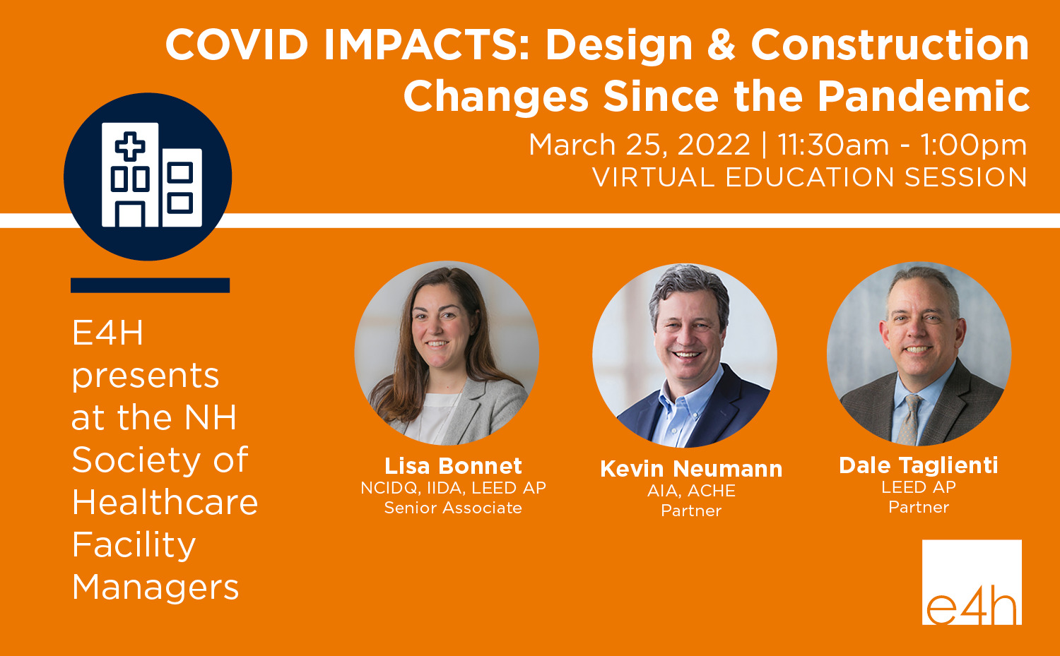 Our expert E4H team of Lisa Bonnet, Kevin Neumann, and Dale Taglienti, will be presenting Covid Impacts: Design & Construction Changes Since the Pandemic at the NH Society of Healthcare Facility Managers. The virtual education session takes place March 25th at 11:30am – 1pm ET. For more information.