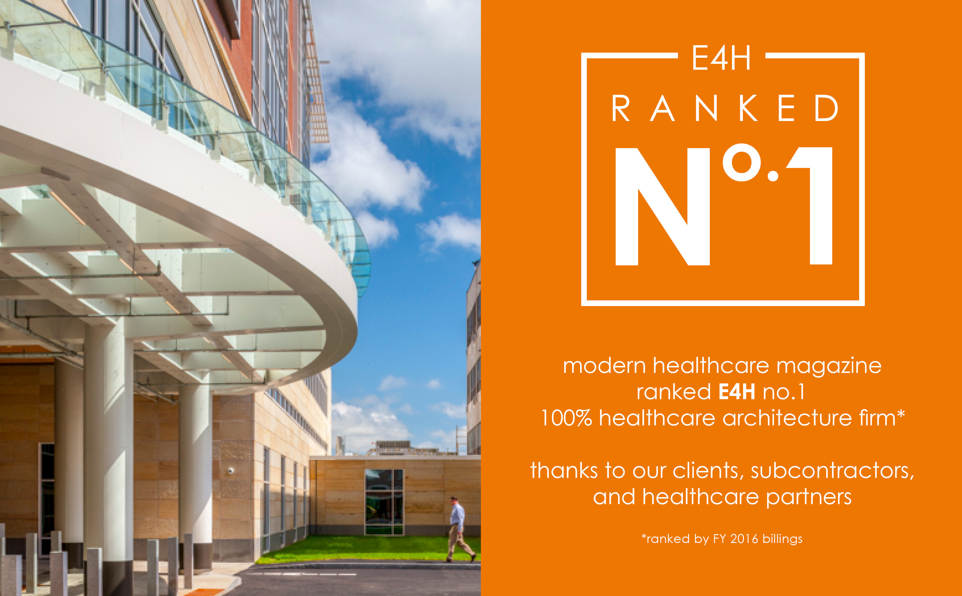 Modern Healthcare Magazine ranked E4H in the top 25 architecture firms in the nation and first among 100% healthcare firms. Thank you to our clients, subcontractors, healthcare partners, and staff for getting us where we are today.