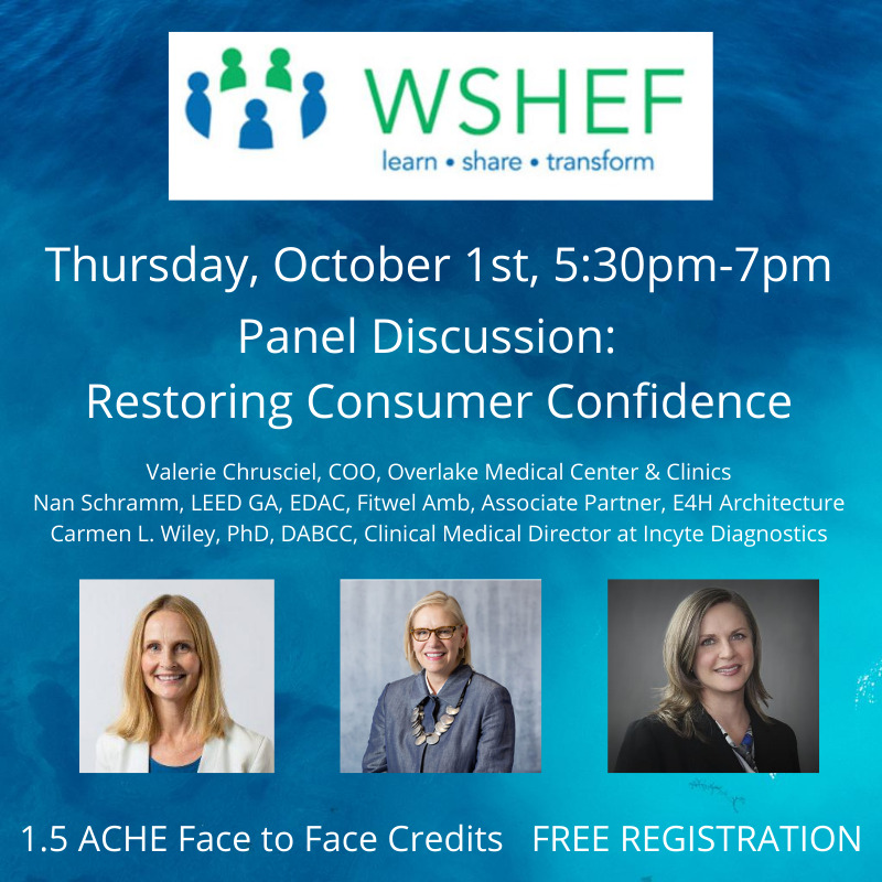 Washington State Healthcare Executives Forum (WSHEF) will be hosting a panel discussion Restoring Consumer Confidence with guest panelist Nan Schramm, LEED GA, EDAC, Fitwel Ambassador, Associate Partner. The ACHE credited event takes place today at 5:30pm PST. More info.